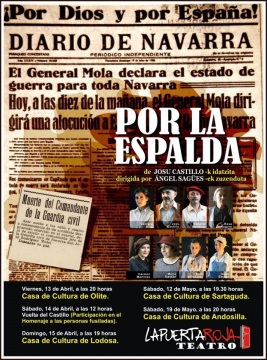 "Por la espalda" es una obra teatral en la que queremos que el público viaje a través del tiempo para situarse, en el día 19 de Julio de 1936, en una sombrerería próxima a la Plaza del Castillo de Pamplona. La sombrerería la regenta una prima de la mujer del Comandante de la Guardia Civil de Pamplona: José Rodríguez Medel, asesinado el día anterior cuando intentaba organizar a los guardias para repeler la sublevación de las tropas del general Mola en contra de la República.
